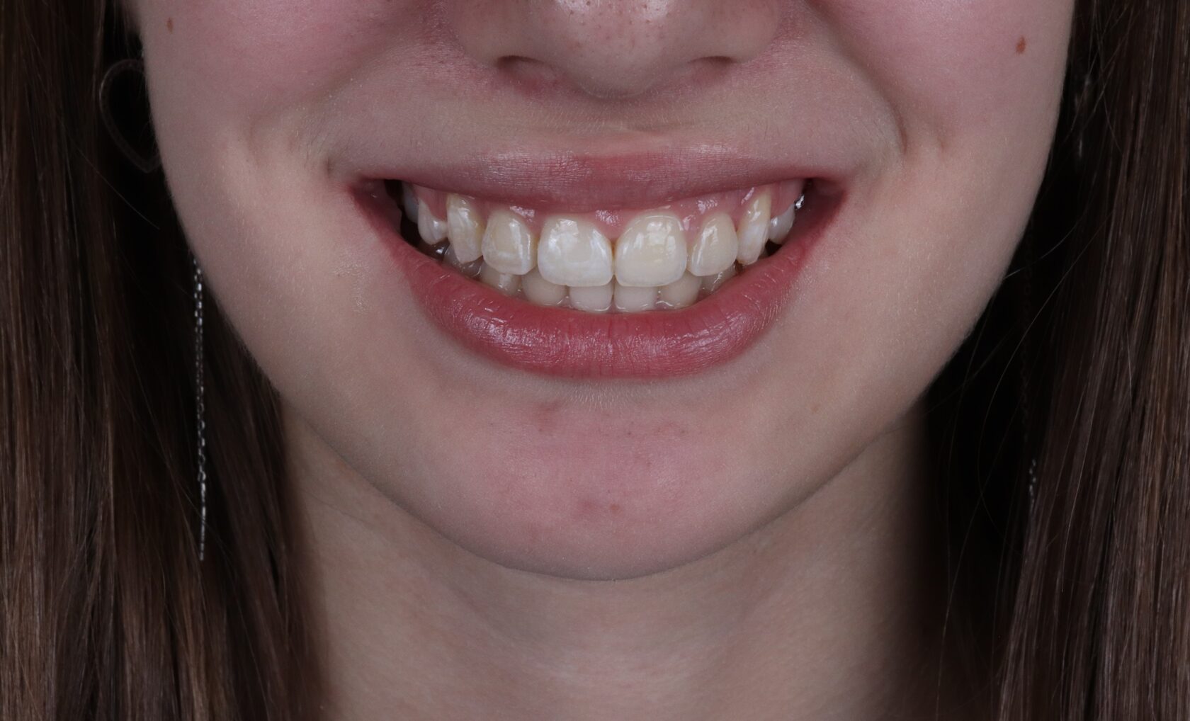 Решение: проведено двучелюстное лечение с помощью брекет-системы. Для получения места и
