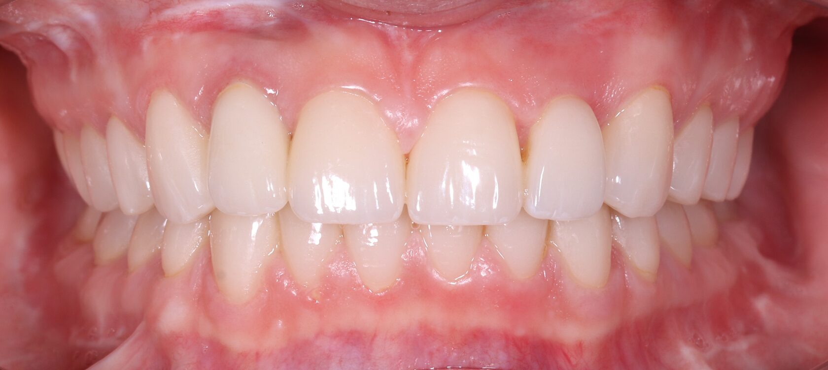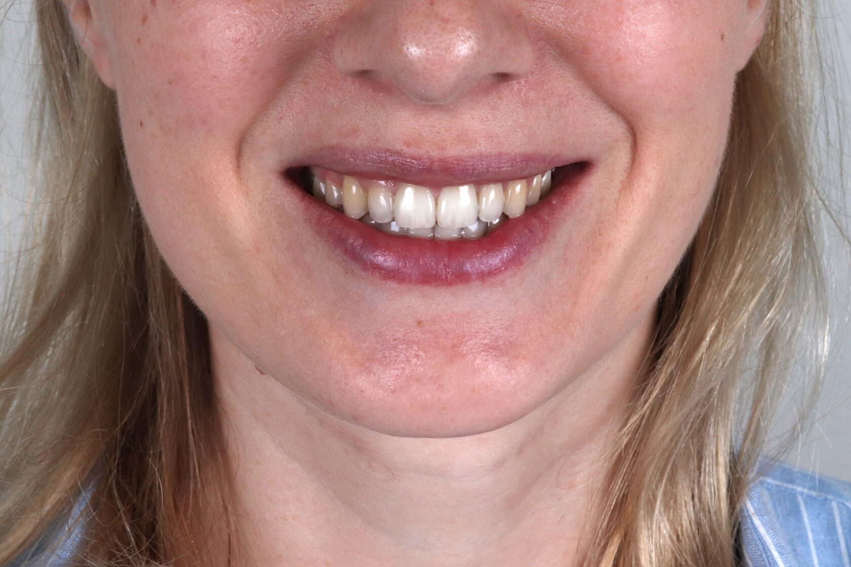 имплантацией бокового резца вверху справа) . Ортодонтическое лечение длилось 2 года и 8